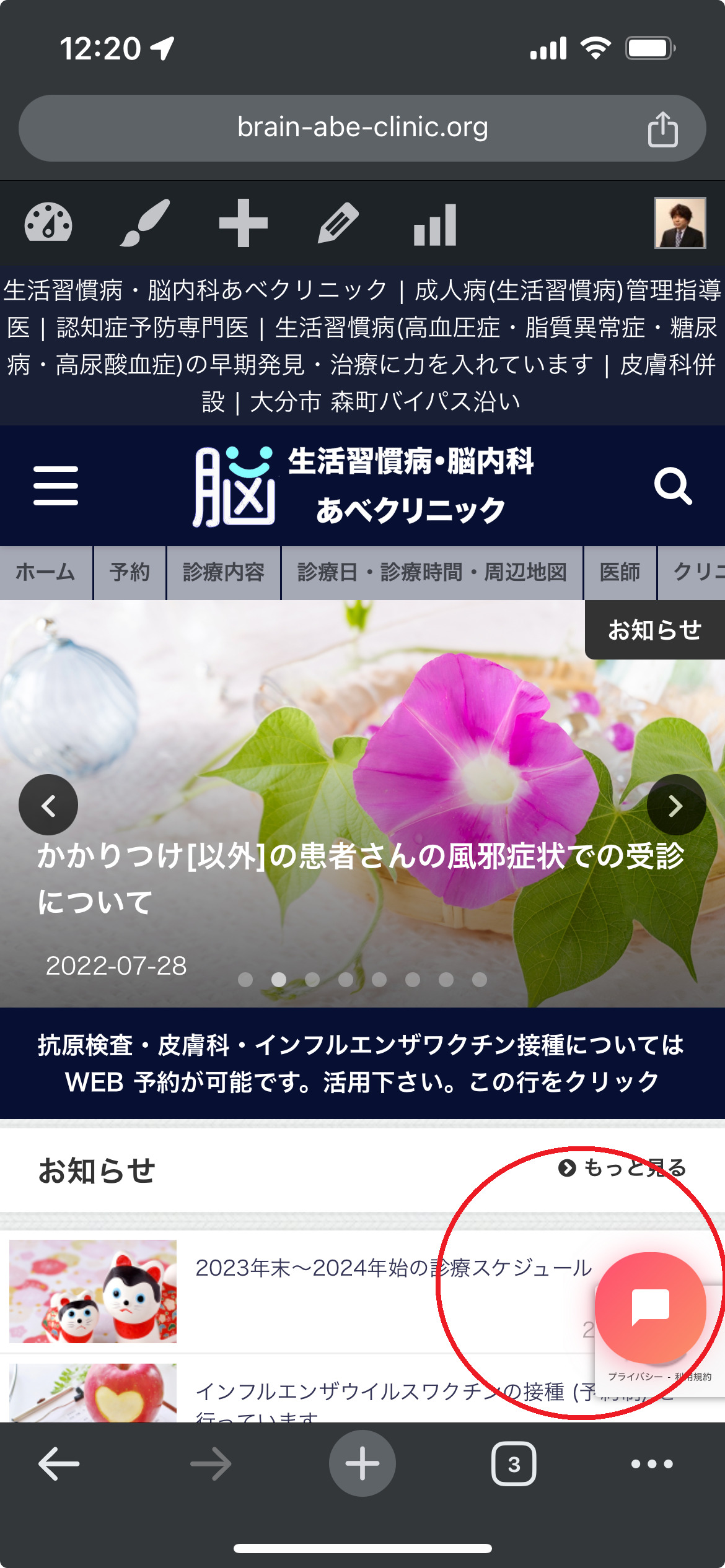 「チャット」へは当院ホームページからアクセスできます。立ち上げ後、30秒以内に現れる下記ボタンよりアクセスできます。